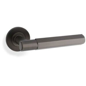 The Alexander and Wilks Spitfire door handle features a modern hexagon feel, against a T-bar cylindric stem silhouette, finished with a plain round rose