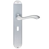 • Arundel door handles on backplate from Fulton & Bray, which has a long backplate with rounded edges and a single visible screw fixing at each end.  The curved lever offers smooth flowing lines to the design
