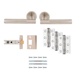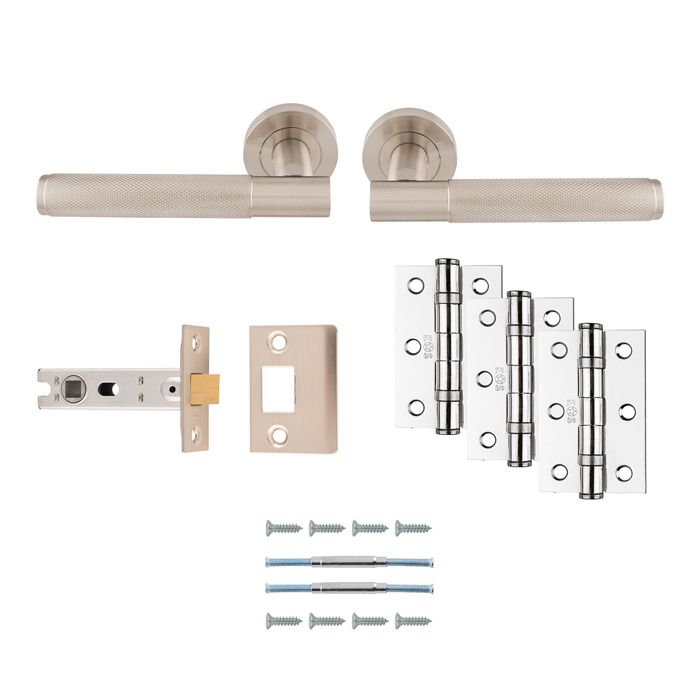 Pack includes a pair of handles, a bolt through 76mm tubular latch and pair and half of hinges. Lagos knurled lever on concealed fix screw on rose