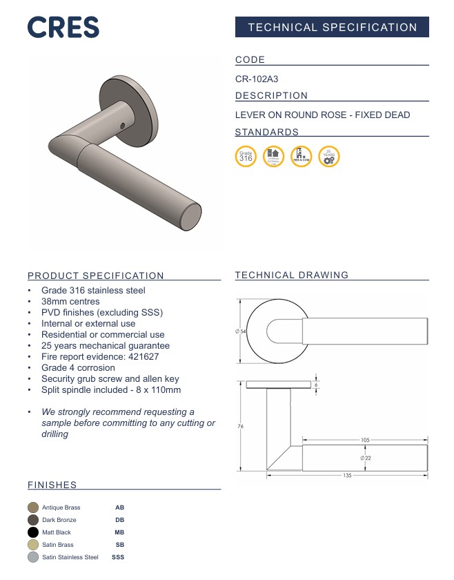 The CR-102 Lever is a luxury door handle manufactured from solid 316g stainless steel with a highly durable PVD finish. Designed for high-end residential and commercial environments, it features a crisp cylindrical design with a clean mitred joint, offering a sharp, architectural aesthetic. The robust, weighty construction delivers a premium feel in hand and outstanding long-term performance. Sold in pairs and available in five elegant finishes, the CR-102 is the perfect choice for contemporary interiors that demand precision and style.