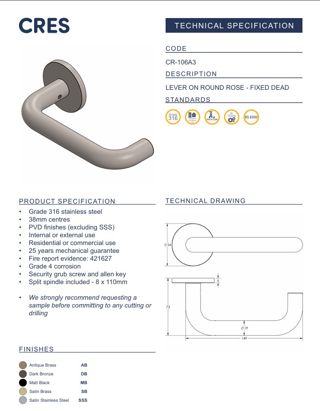 The CR-106 Lever is a return-to-door style handle crafted from 316g stainless steel with a durable PVD finish, offering both strength and compliance with accessibility standards. Its smooth, rounded form curves back towards the door, making it fully DDA approved and ideal for use in care facilities, public buildings, and commercial spaces where ease of use and safety are paramount. The robust design provides a solid, weighty feel, while maintaining a sleek, modern aesthetic. Sold in pairs and available in five premium finishes.