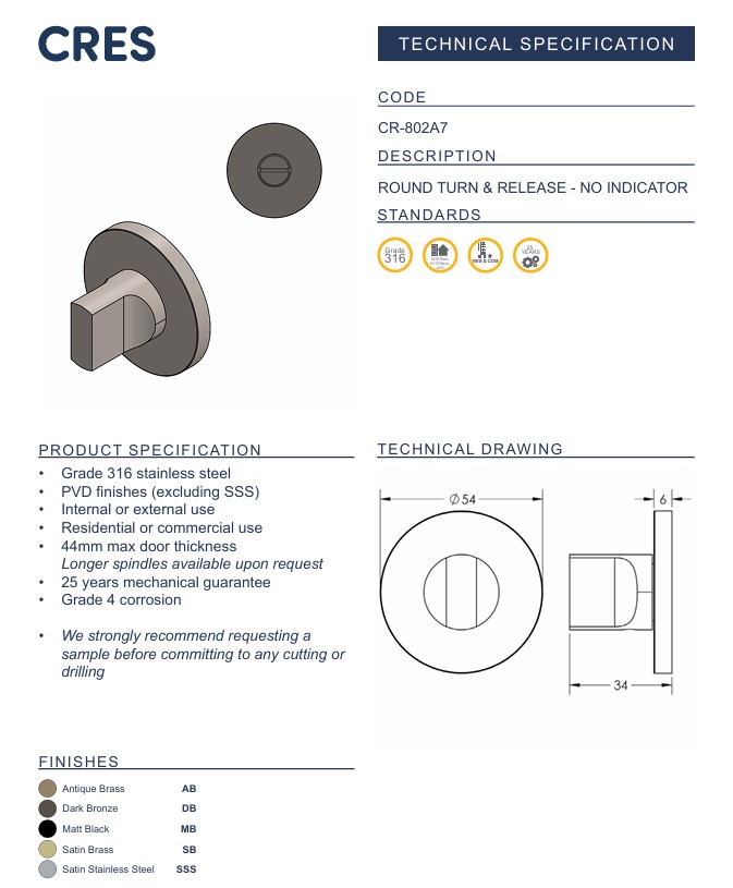 The CRES802 Turn and Release is a contemporary privacy accessory, designed to complement the full CR lever range. Manufactured from solid 316 stainless steel with a durable PVD finish, it features a sculpted rectangular thumb turn set against a clean round rose.