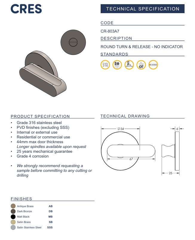 The CRES803 is a bold evolution in privacy accessory design—streamlined, sculptural, and built to align with the architectural intent of the full CRES lever range. Its elongated oval thumb turn adds visual balance and a tactile presence, while the solid 316 stainless steel core and PVD finish offer enduring quality featured on a round rose