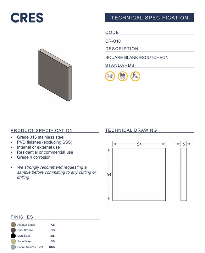 The CRES Blank Square Escutcheon offers a refined, minimal finish for doors where keyholes or turn functions are not required. Crafted from solid Grade 316 stainless steel. it provides a clean, architectural detail that complements the full CRES range. Ideal for maintaining design continuity across internal or external doors in high-end residential and commercial projects.