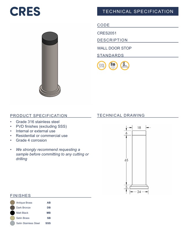 The CRES2001 Wall Mounted Door Stop offers a minimalist, contemporary design crafted from premium 316-grade stainless steel, providing both functionality and discreet elegance.