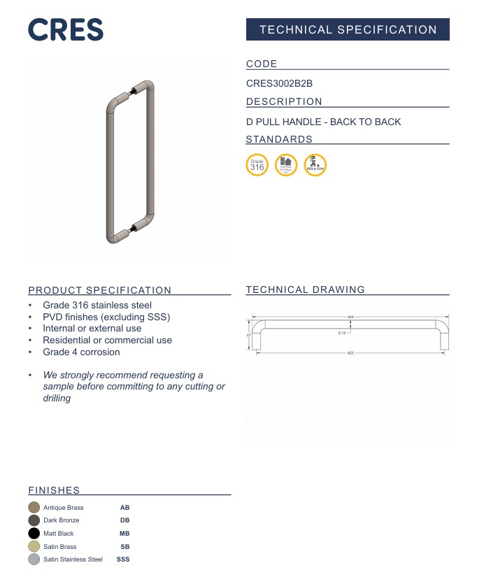 A classic profile, redefined. The CRES3002 D Pull Handle is a timeless form now executed in premium-grade 316 stainless steel with a choice of luxury PVD finishes. Designed for both internal and external use, its rounded corners and smooth curvature offer a comfortable grip with enduring style.