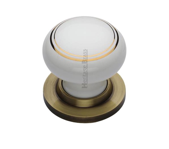 Heritage Brass Gold Line White Porcelain Mortice Door Knobs, Antique Brass Rose (sold in pairs)