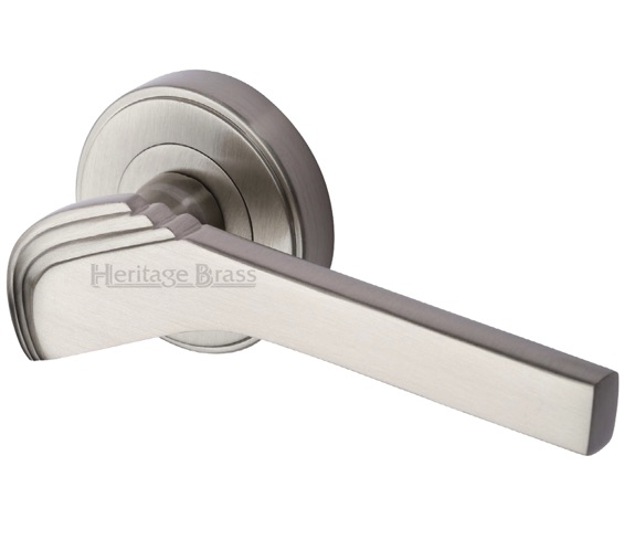 Heritage Brass Tiffany Art Deco Style Door Handles On Round Rose, Satin Nickel (sold in pairs)
