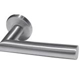 Julian Door Handles On Round Rose, Satin Stainless Steel (sold in pairs)