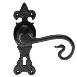 Black Antique lever on backplate. Elegant and visually impressive the curly-tail lever sits on an elaborate fleur-de-lys backplate. This striking and unique design and would be suitable for many different applications throughout the home