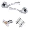 • Key Features: Design: Sleek and contemporary T-Bar lever on rose design for a stylish, minimalist aesthetic. Material: High-quality polished chrome finish for durability and resistance to tarnishing. Latch: 65mm tubular latch for secure and smooth door operation. Hinges: Includes two 75mm ball bearing hinges for smooth, noiseless movement and long-lasting performance. Pack: Complete door handle set suitable for easy installation on internal doors.