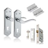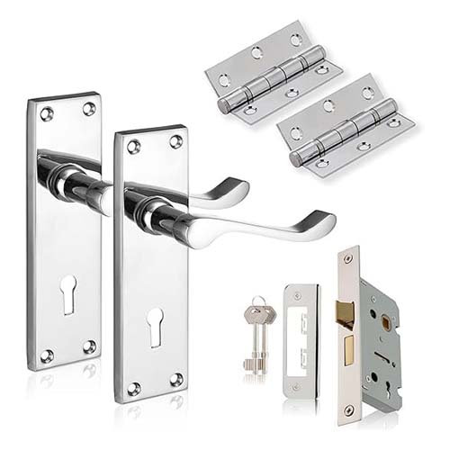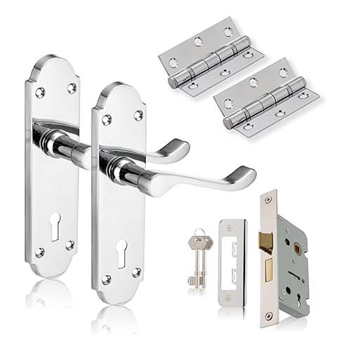 - Key Features Handle: Luxury lever design on a back plate, crafted for comfort and style. Finishes: Available in Polished Chrome (PC), Polished Brass (PB), and Satin Chrome (SCP) to suit modern, classic, or subtle aesthetics. Lock: Includes a durable sash lock for enhanced door security. Hinges: High-quality ball-bearing hinges ensure smooth, noise-free door operation. Complete Set: Includes all essential components for a professional and convenient installation.