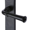 • A simple black door handle on backplate, with a straight lever and a rectangular shaped backplate, part of the latest smooth, black iron range from M. Marcus