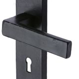 • A simple black door handle on backplate, with a straight lever and a rectangular shaped backplate, part of the latest smooth, black iron range from M. Marcus