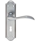 Classically styled curved lever on a shaped backplate with detailing to both lever and backplate. Suitable for a more traditional doors