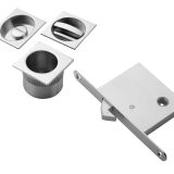 • Sliding bathroom door set comprising of a turn and release, finger pull and a lock