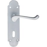 • This Project Door Handle has classic curved shaped backplate with two visible screw fixings at each end of the plate and a Victorian scroll shaped lever