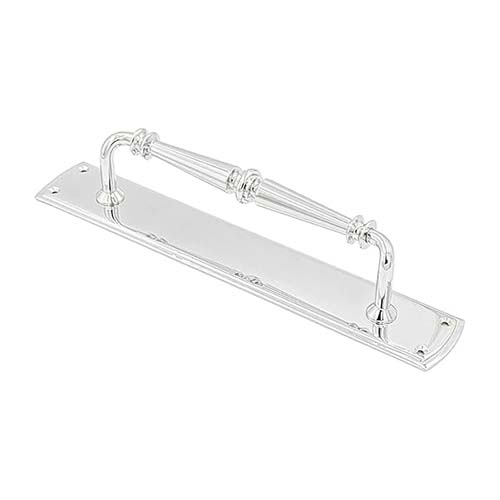 - The Renata Door Pull Handle on Backplate in Polished Chrome is a sleek and contemporary hardware piece, combining style and functionality.