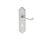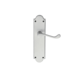 A conventional Victorian style upturned handle on a shaped backplate, elegant and stylish. The back plate has an shouldered shape that gives a classical appearance, while the lever features a scroll style that is very easy to grip. The simplicity of the handle makes it versatile and suitable for many environments. Comes with a 10 year mechanical guarantee and is Fire door rated. Suitable for domestic use. Available in latch, lock, bathroom and euro in satin chrome finishes