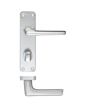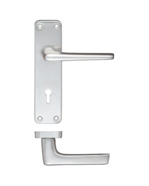 • The Zoo Hardware Contract Aluminium door handle on backplate is a satin aluminium straight, slim lever door handle on a simple rectangular-shaped backplate, that has a hole in each corner for easy and sturdy fixing
